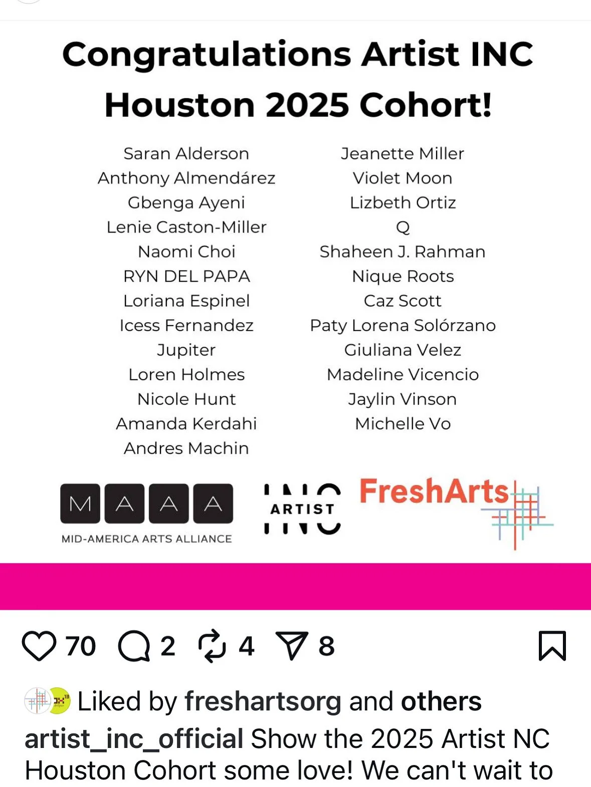 Wow, I’ve been so honored to have been accepted into the Artist Inc 2025 Cohort this fall from Sept to Nov 2025. The experience has been so helpful to better the business side of my Fine Arts practice. On Saturday Nov 15, 2025 please join us at our graduation night for the sharing of our work. The event will start promptly at 6pm and go until 9:30, as all 25 of the cohort members present a 5 min long slide deck about ourselves and what we have to offer the world. The location will be at the Aurora Picture Show, 5601 Navigation Blvd, in Houston, Texas. I have personally chosen to present on my signature body of work, InnerConnected. Hope to see you there.